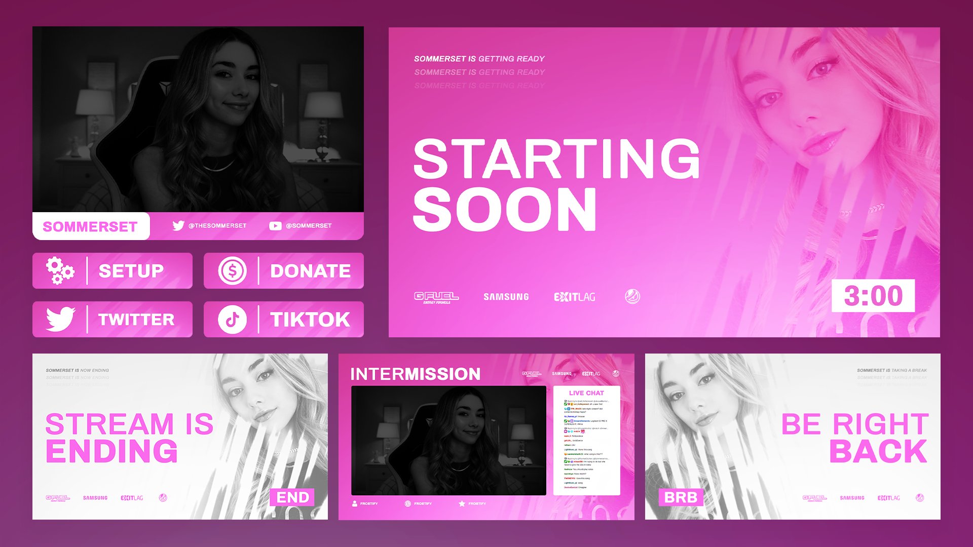 For the Sommerset's stream package, I built the design system around an inverse color approach across different screens, alternating between pink and white to create visual variety while keeping the overall package feeling cohesive and intentional. Her headshot was incorporated as a recurring secondary asset, weaving her personality directly into the branding.